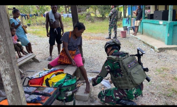 Salah Satu Kepedulian Satgas Pamtas Statis Yonif 131/BRS Pada Warga Papua Laksanakan Pelayanan Kesehatan Keliling